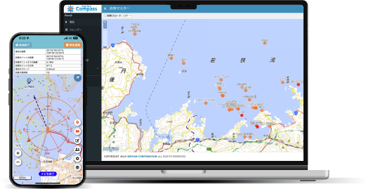スマートフォンで利用する「マリンコンパスアプリ」と、PCやタブレットで利用する「共有マスター」機能があります。