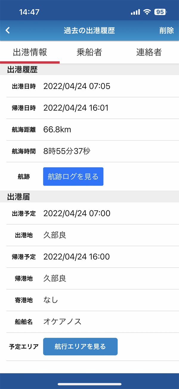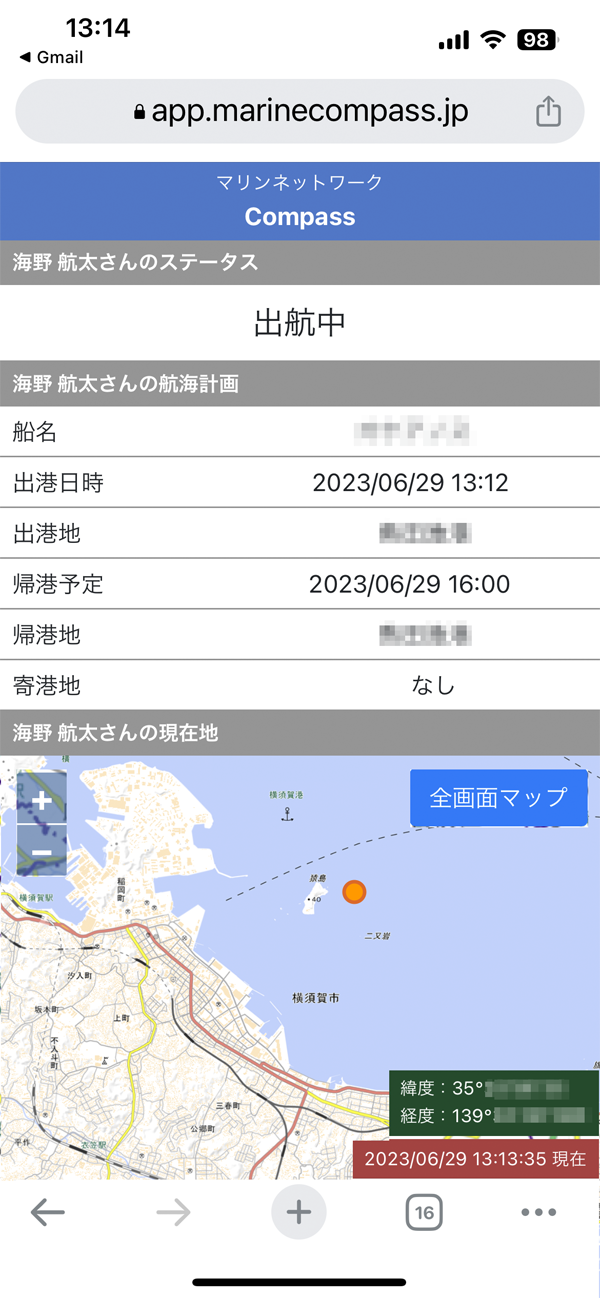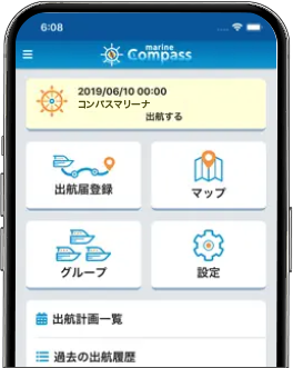 アプリ画面で出港登録し、設定した連絡者と出入港、航海中の位置を共有