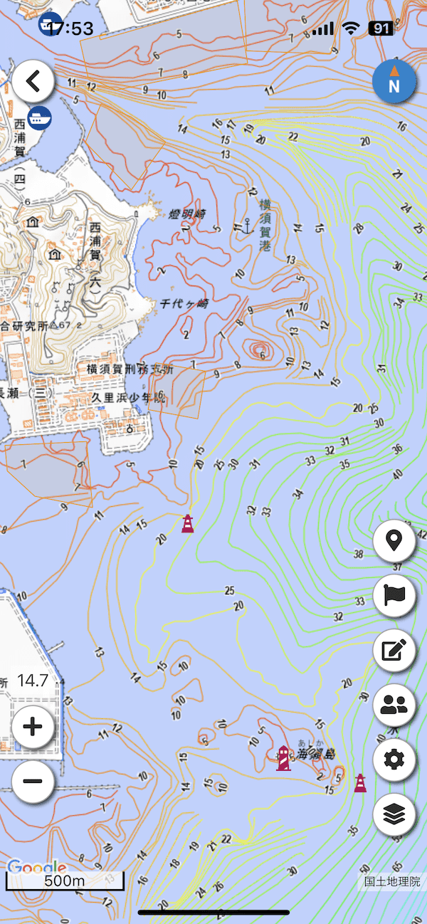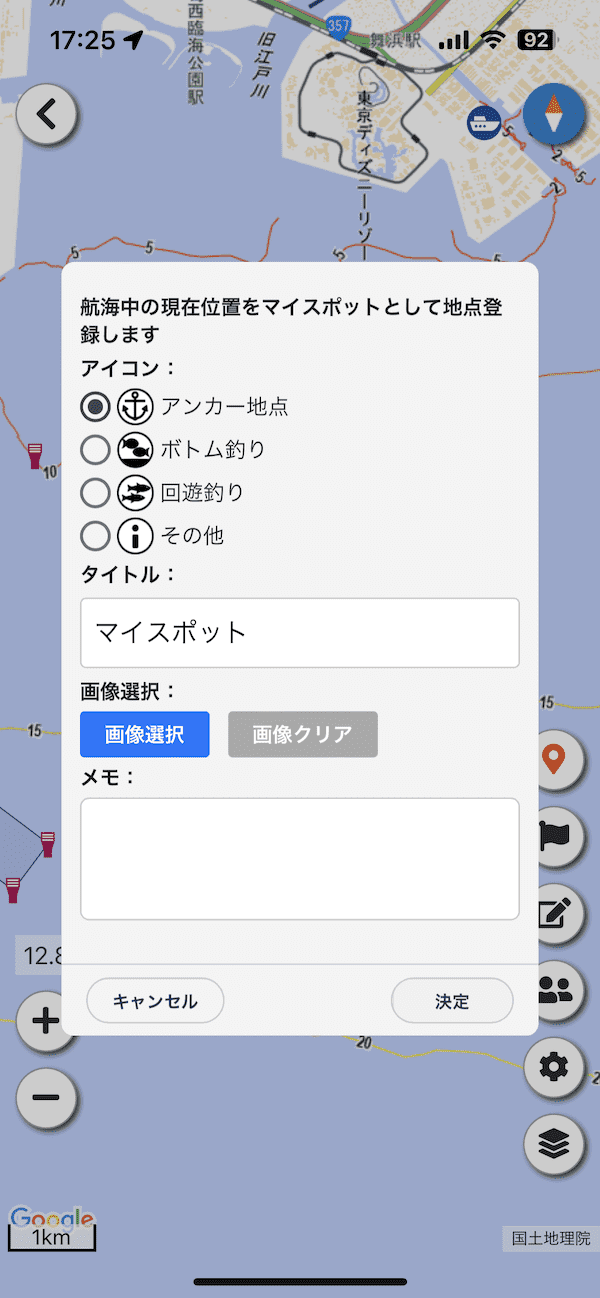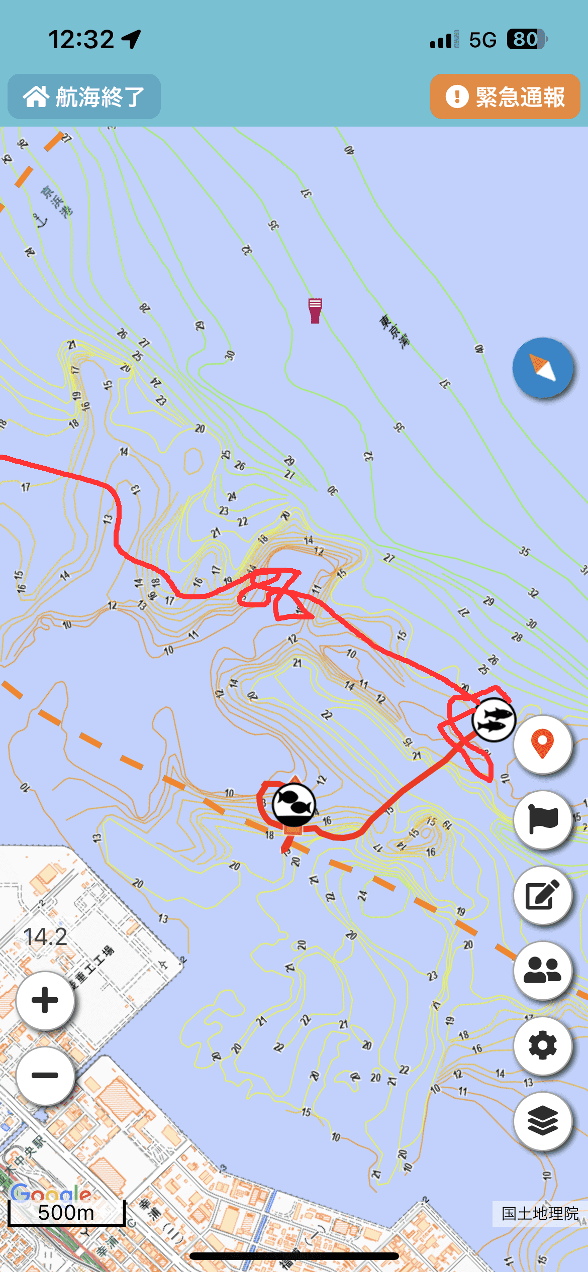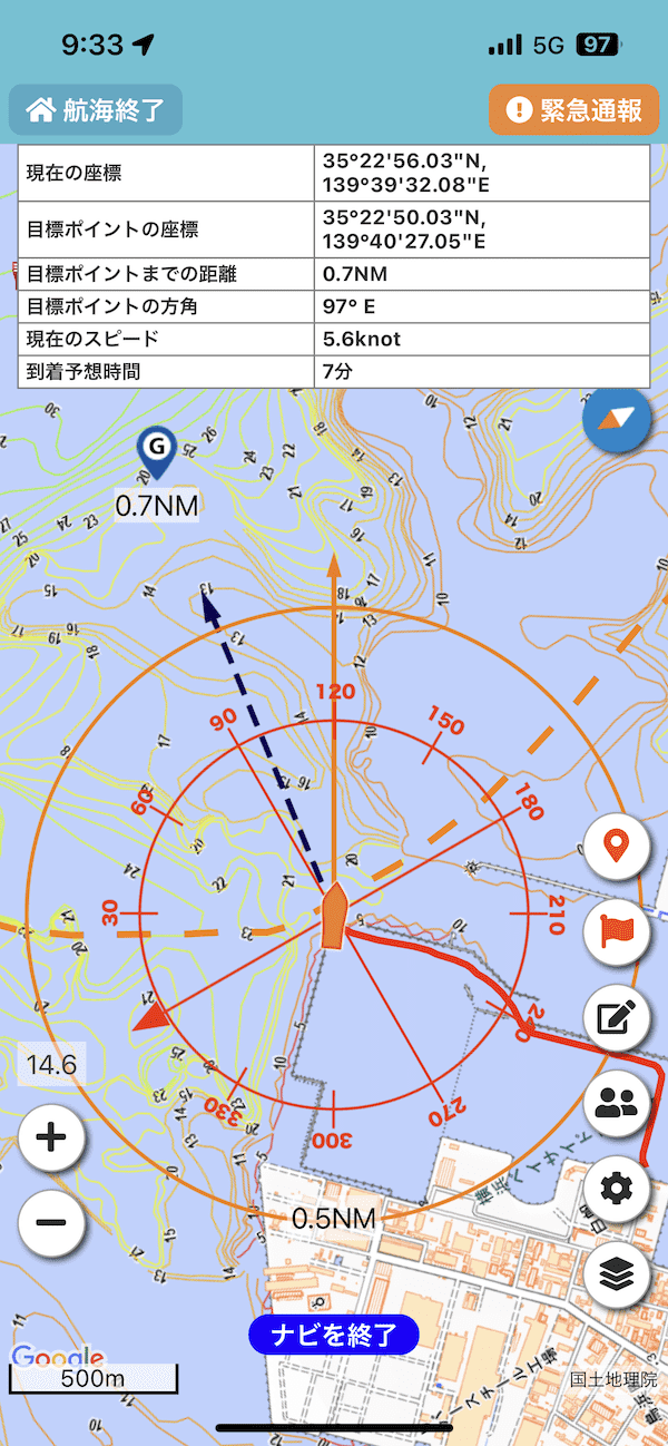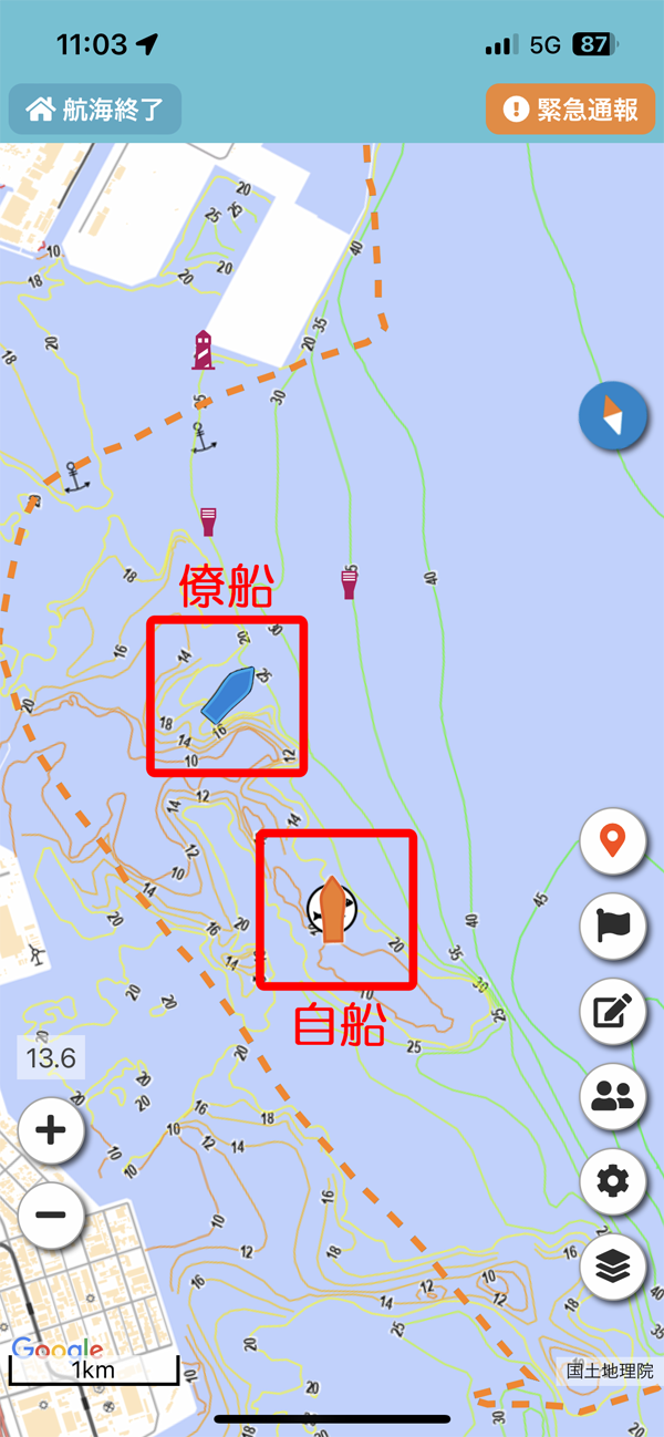 出港後の自艇位置と航跡をアプリのマップ画面で表示