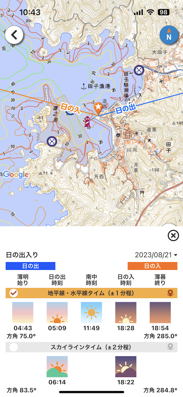 画面の任意地点をタップでその場所からの日の出入り方向、時刻を確認
