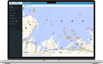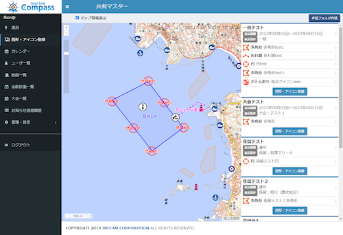 マップ画面に大会エリアや警戒艇位置、航路等を作図し、関連付いたアプリのマップ画面、一般のアプリ画面で共有化できます