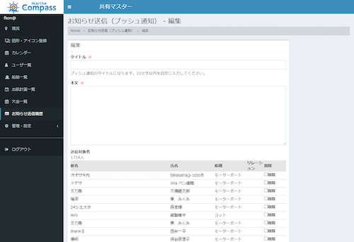 ユーザー一覧、船舶一覧、出航計画一覧で検索した艇のアプリへ、メッセージ等の一斉送信ができます